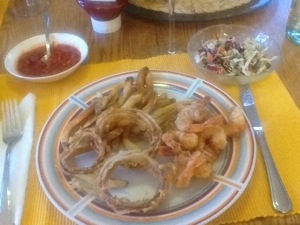 We haven’t had the deep fryer out for a while, so we decided it was time to treat ourselves. We ended up putting together a meal of tempura shrimp, homemade French fries…and when there was leftover batter, we sliced up a big onion and made a few onion rings as well. Add to that a tasty Asian inspired coleslaw and it was almost like we were on the deck overlooking Los Arcos and the beautiful water of the Sea of Cortez!