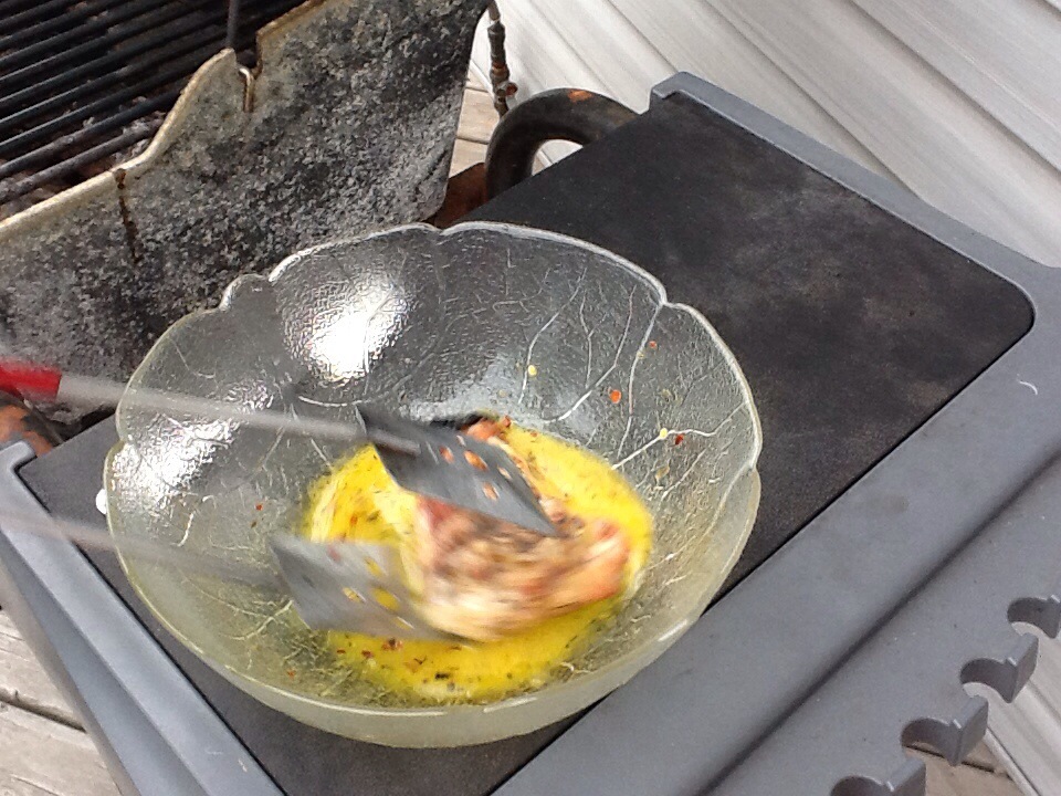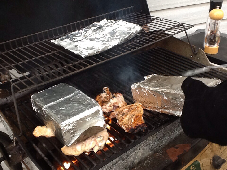 First, find some building bricks and wrap them in tinfoil. This recipe can be for up to eight thighs, but we made only four. My husband was the expert griller in this one. I guess I was the brains and he was the brawn of this operation!