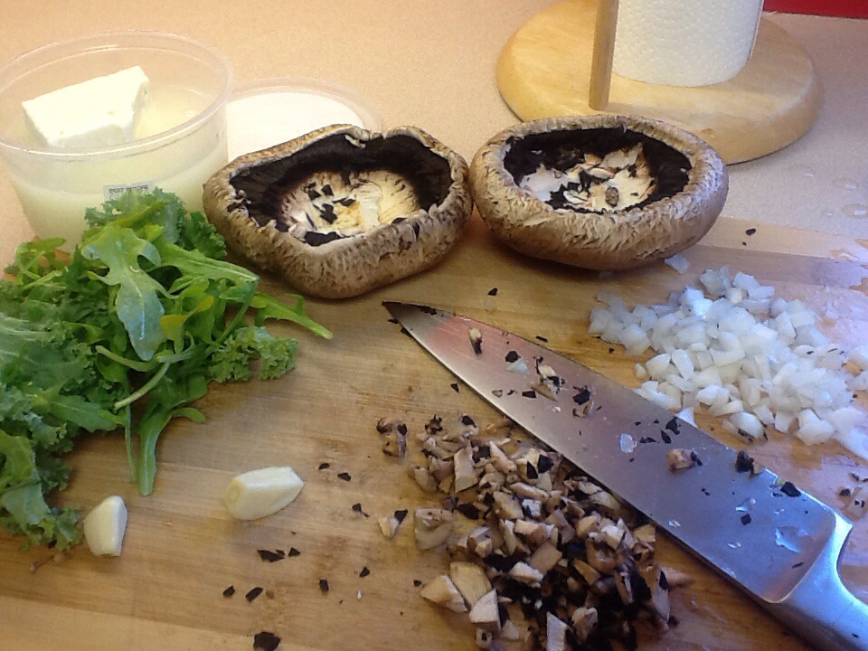Usually this is made with spinach, but I had kale in the fridge so that’s what we used. I scooped out the mushroom stems and chopped them up with kale and onions.