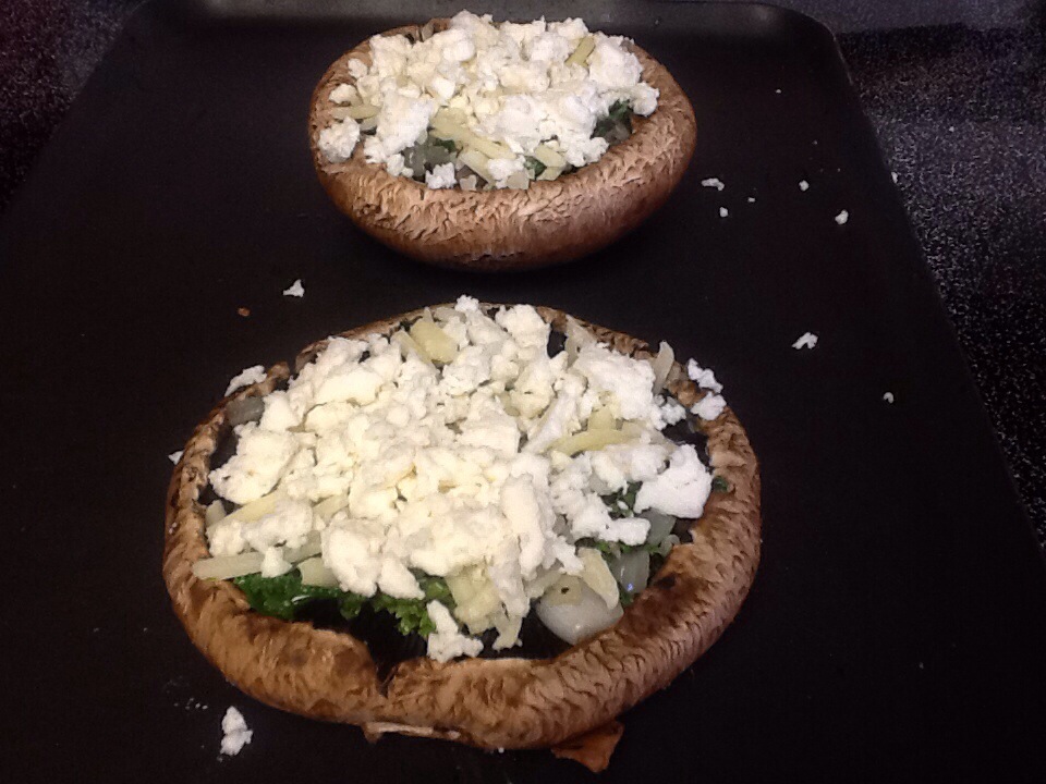 After frying, I filled the mushrooms with the mixture and covered them with parmesan and feta cheeses (lots of feta – there can never be too much feta!).