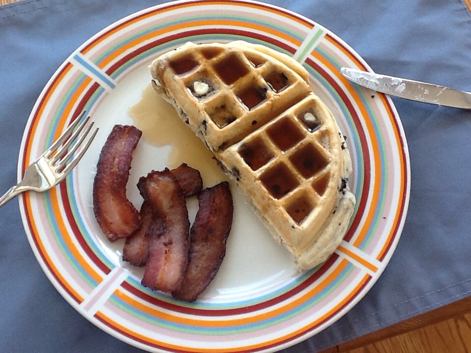 This morning I added frozen blueberries to the batter to make blueberry waffles. Feel free to add fruit, or serve the fruit on top of the waffles.