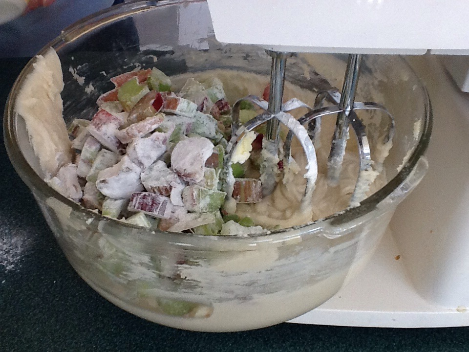 Add the rhubarb to the batter and blend.