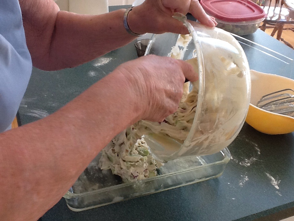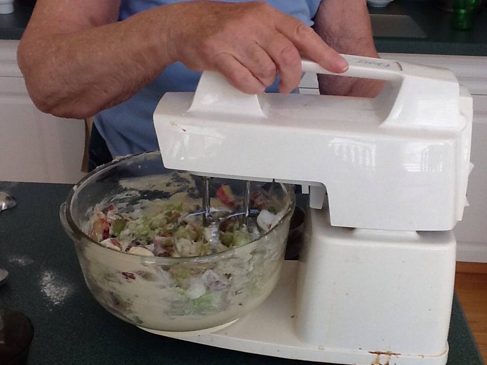 Sift the two cups of flour, salt and baking soda into a separate bowl. In a third bowl, blend one tablespoon of flour into the rhubarb. Mom ended up using almost three cups of rhubarb.