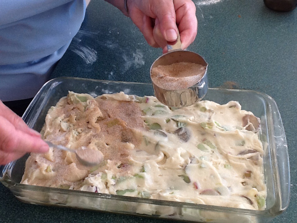 Mix together half a cup of sugar and one teaspoon of cinnamon, and sprinkle over the top of the batter. Next time we make the cake, we would reduce the sugar to a quarter cup as the rhubarb is sweet enough.