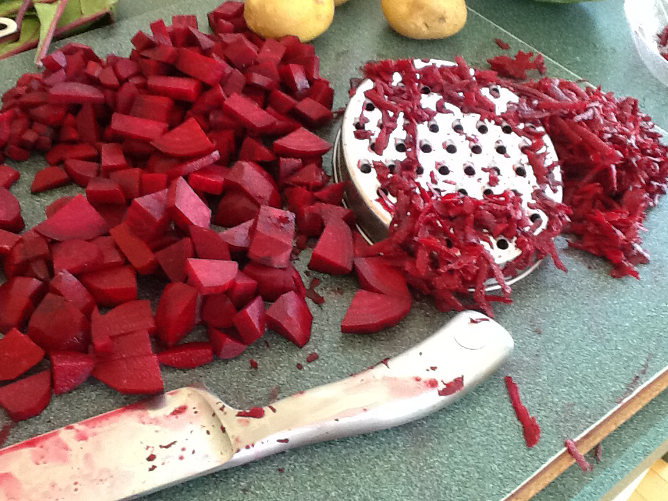 Peel and dice beets (at least 2 cups) and peel and grate another cup of beets. Put the diced beets in the pot and set aside the grated beets. I recommend wearing gloves and an apron to handle the beets.
