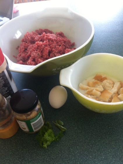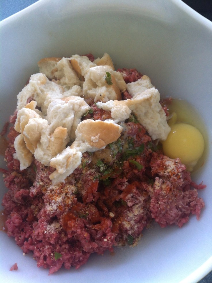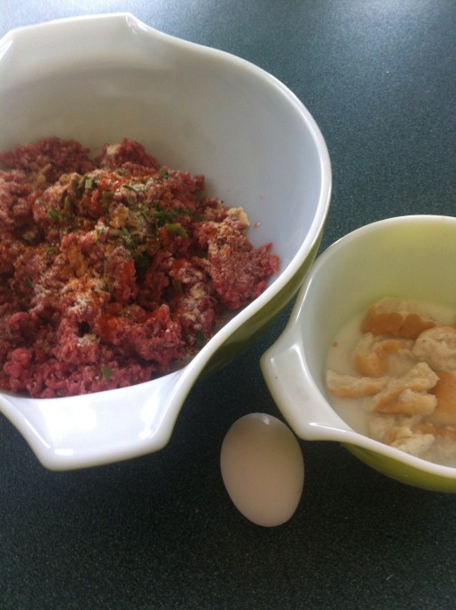 First, what you’ll need: two pounds of ground beef; two slices of a big white bread like Texas Toast (I actually used two hot dog buns as we had them on hand); one egg; one cup of whole milk; garlic; pepper; seasoning salt; parmesan cheese; fresh herbs – I used parsley and oregano, but you can season with whatever you prefer.
