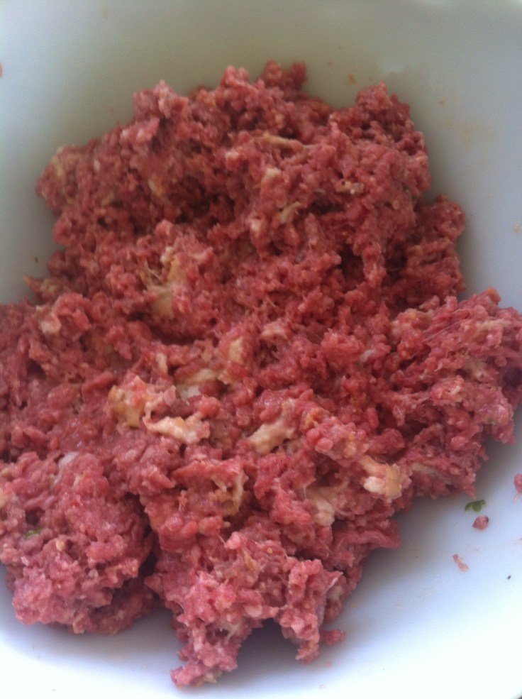 Mix everything together, but just like hamburgers, don’t over-work the meat. It makes it tough.