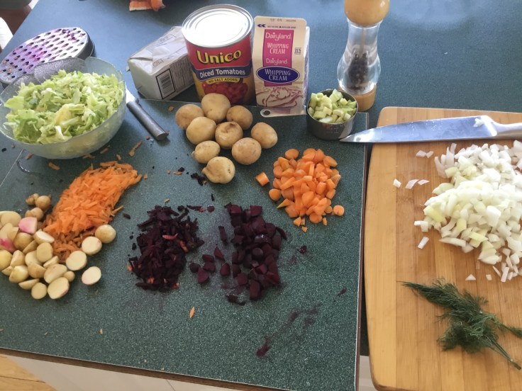 First, you will need several beets, about 4 carrots, 6 potatoes, a cabbage, an onion, a can of tomatoes (whole or diced), celery, butter, whipping cream and dill.
