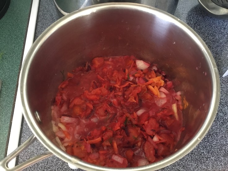 In the medium pot, melt half the butter and fry the onion until glossy and translucent. Season with salt and pepper and a little bit of dill. Add the tomatoes, grated carrots and grated beets. Boil for 20 minutes, stirring constantly and breaking up the tomatoes. It will turn into a rich red stew. After 20 minutes, take off the heat and set aside.