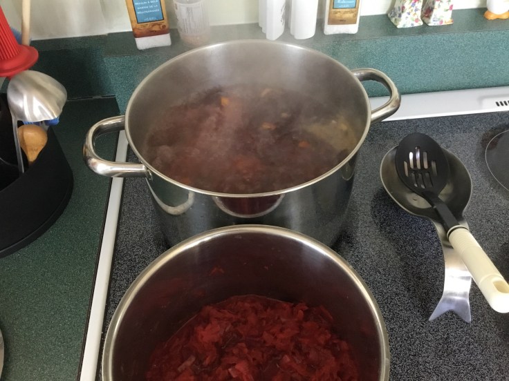 Fill the soup pot with water and bring to a boil. To this water, add the 3 potatoes that you cut in half, the diced beets, diced carrots, celery and a generous dash of salt. Boil until the potatoes are done.