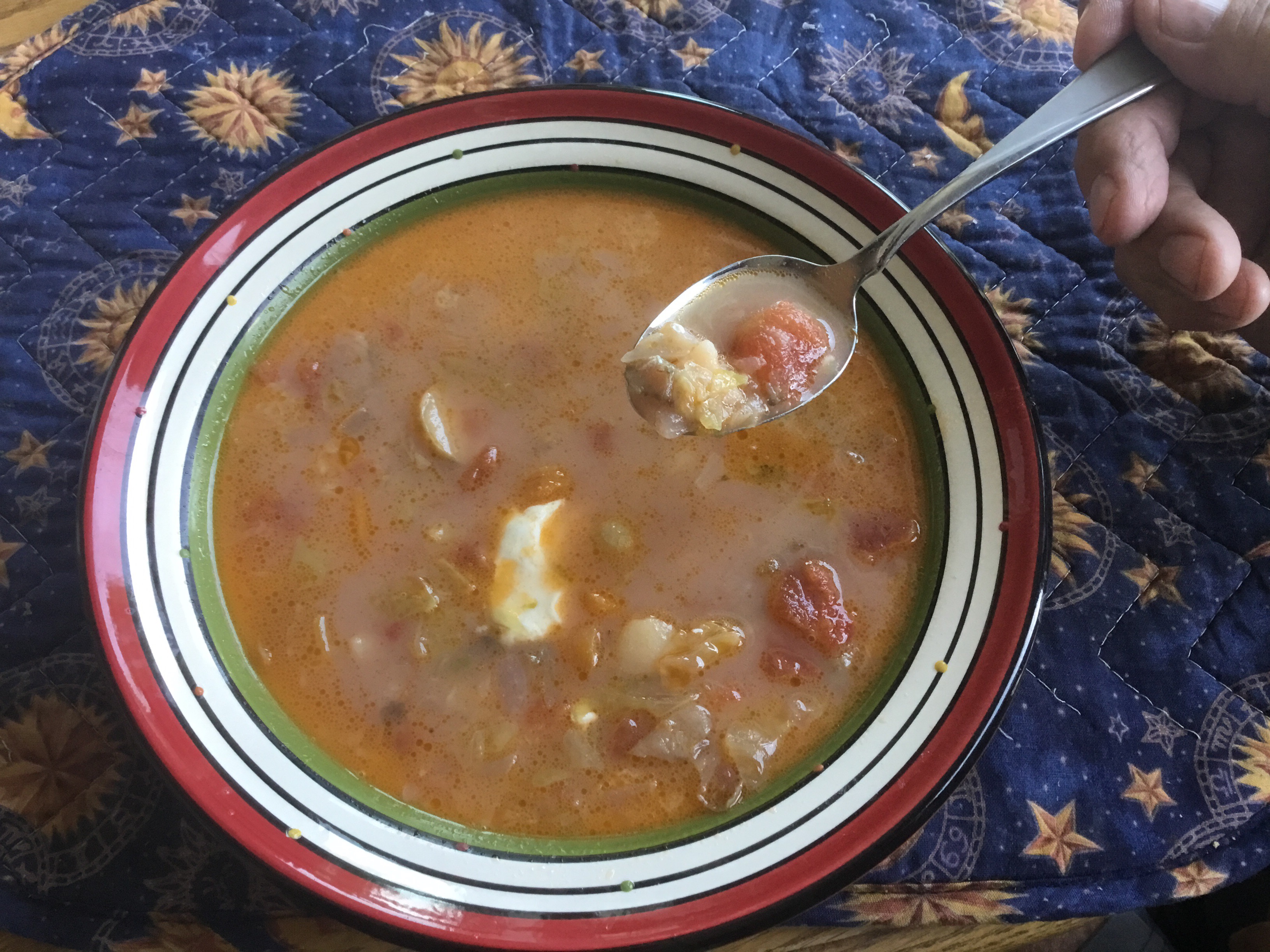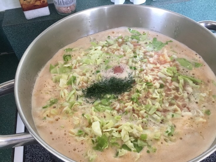 To the water, add the remaining butter, whipping cream and diced potatoes. Boil for one minute, then add the tomato “stew” that you made in the smaller pot. Add the cabbage and the mashed potatoes, as well as the dill. I let this simmer for several hours, tasting and adjusting salt if necessary.