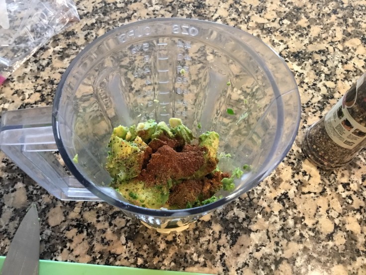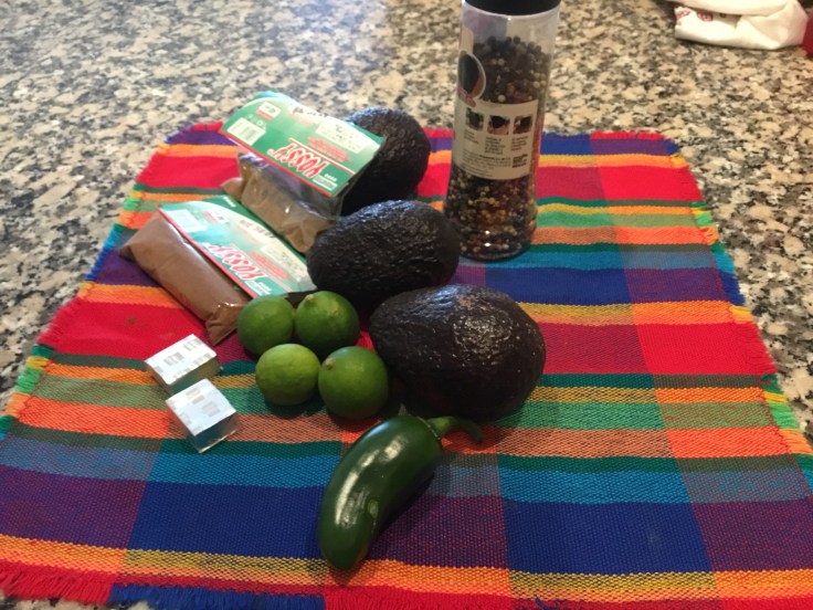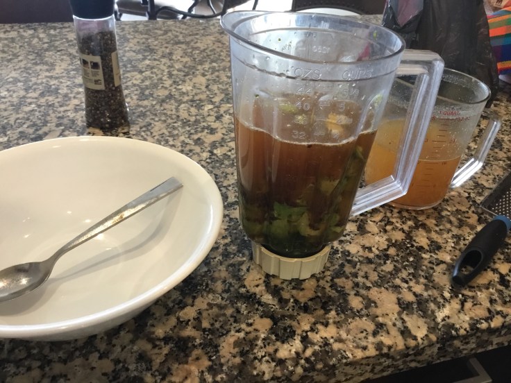 To make this, you need 3 avocados, several limes, a jalapeño pepper (the amount of which you can adjust depending how much you like the heat), cumin, chili powder, salt and pepper, and 4 cups chilled veggie broth. I used cubes but you can use containers of broth too. You also need a blender.