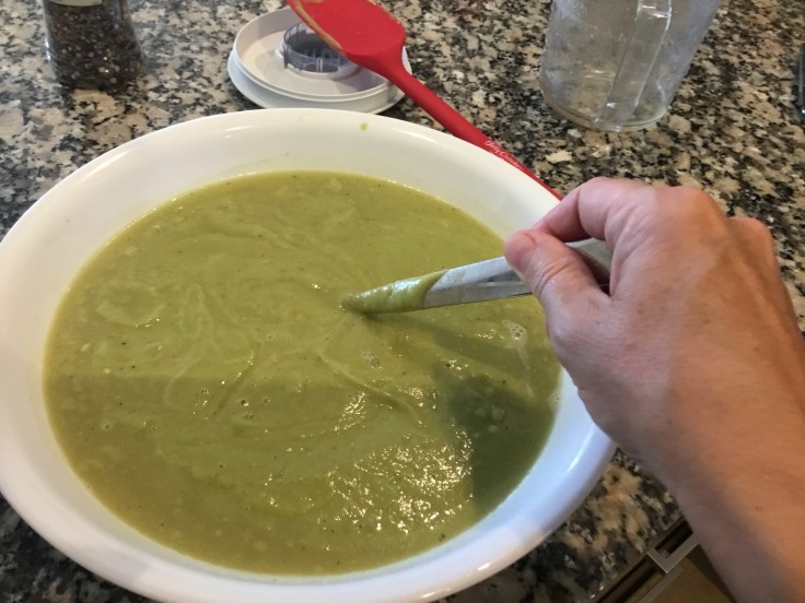 Puree until smooth, and then pour into a large bowl and add the remaining broth. Chill at least two hours. If it’s too thick you can add more broth, although I have never had to do that.