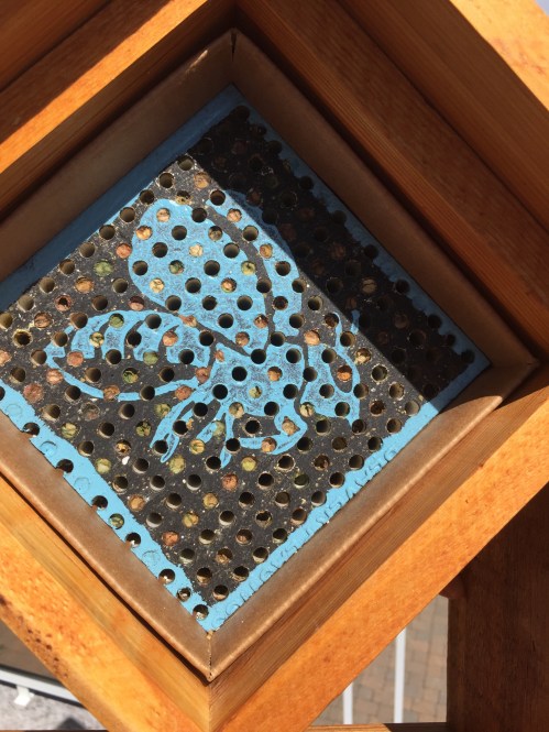 The females return to the nesting block to lay babies inside cocoons in the holes. As the holes fill up with cocoons, the bees cap them. The adult bees eventually die and the larvae wait safely inside the cocoons until the following spring. A single female leafcutter bee visits hundreds if not thousands of blossoms each day, mixing pollen and nectar to make a paste that feeds their larvae.